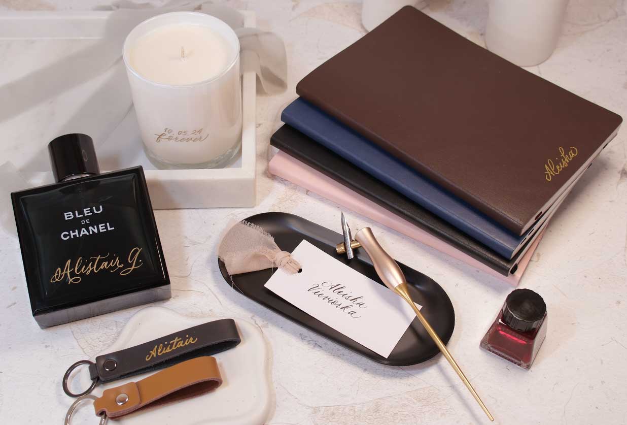 In-studio personalized engraving + calligraphy for wedding events, perfume bottles, wine bottles & other special gifts.